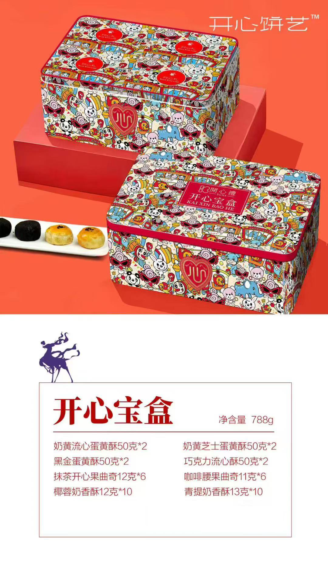 奶黄流心蛋黄酥50克*2 奶黄芝士蛋黄酥50克*2 黑金蛋黄酥50克*2 巧克力流心酥50克*2 抹茶开心果曲奇12克*6 咖啡腰果曲奇11克*6 椰蓉奶香酥12克*10 …